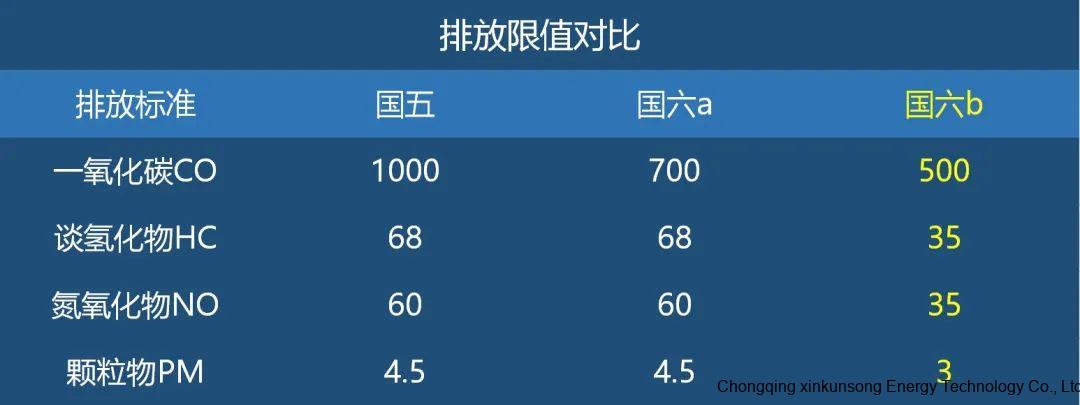 與國5排放標準相比,國6b車型的氮氧化物(NOX)排放量將下降42%,顆粒物(PM)下降33%不能超過每千米3毫克,揮發性有機化合物蒸發排放限值則下降65%,總碳氫化合物(THC)和非甲烷碳氫化合物(NMHC)分別下降50%。